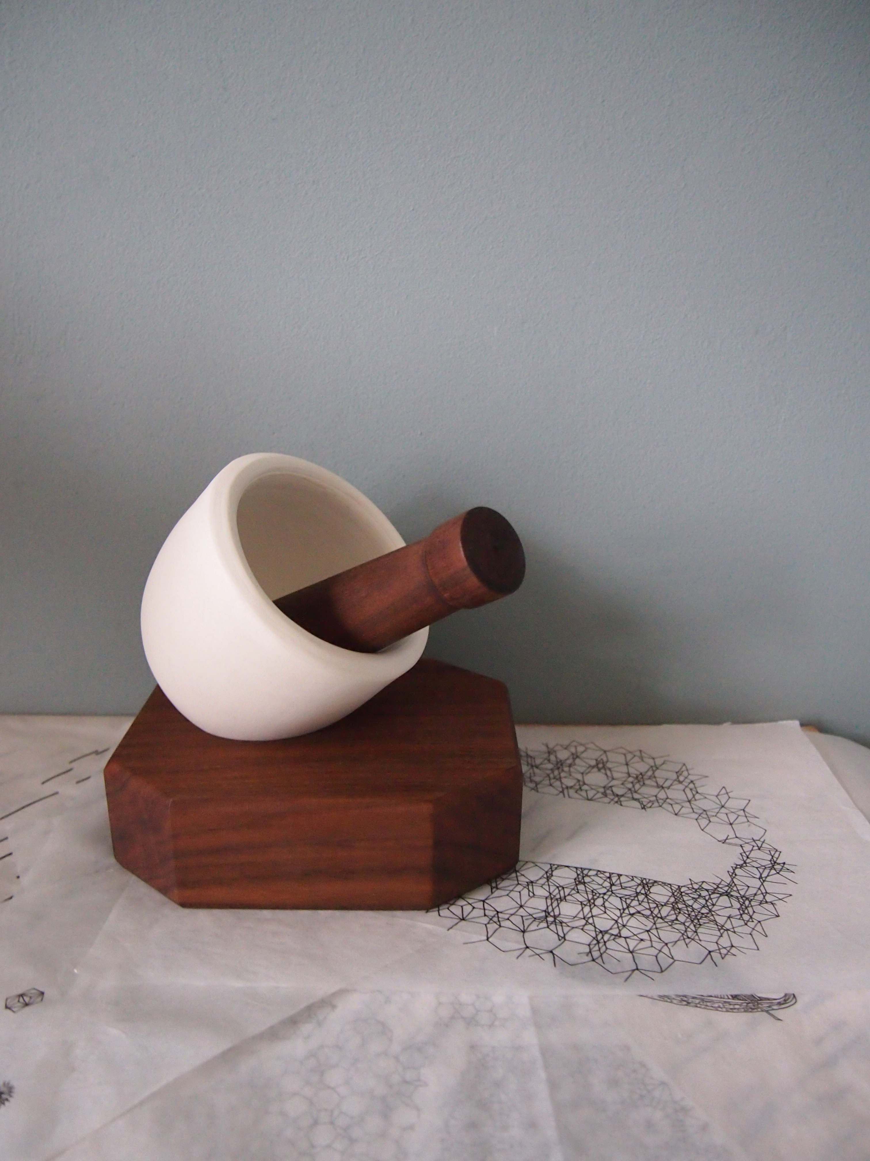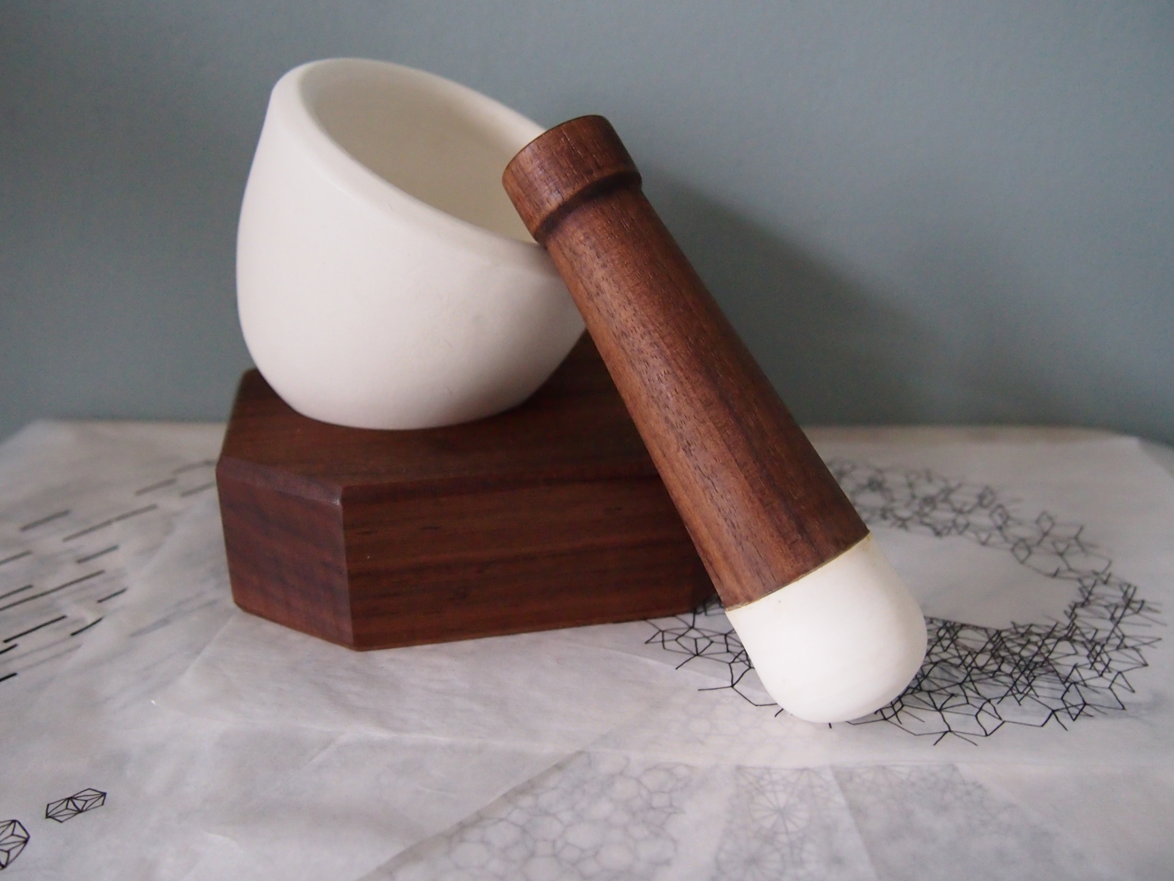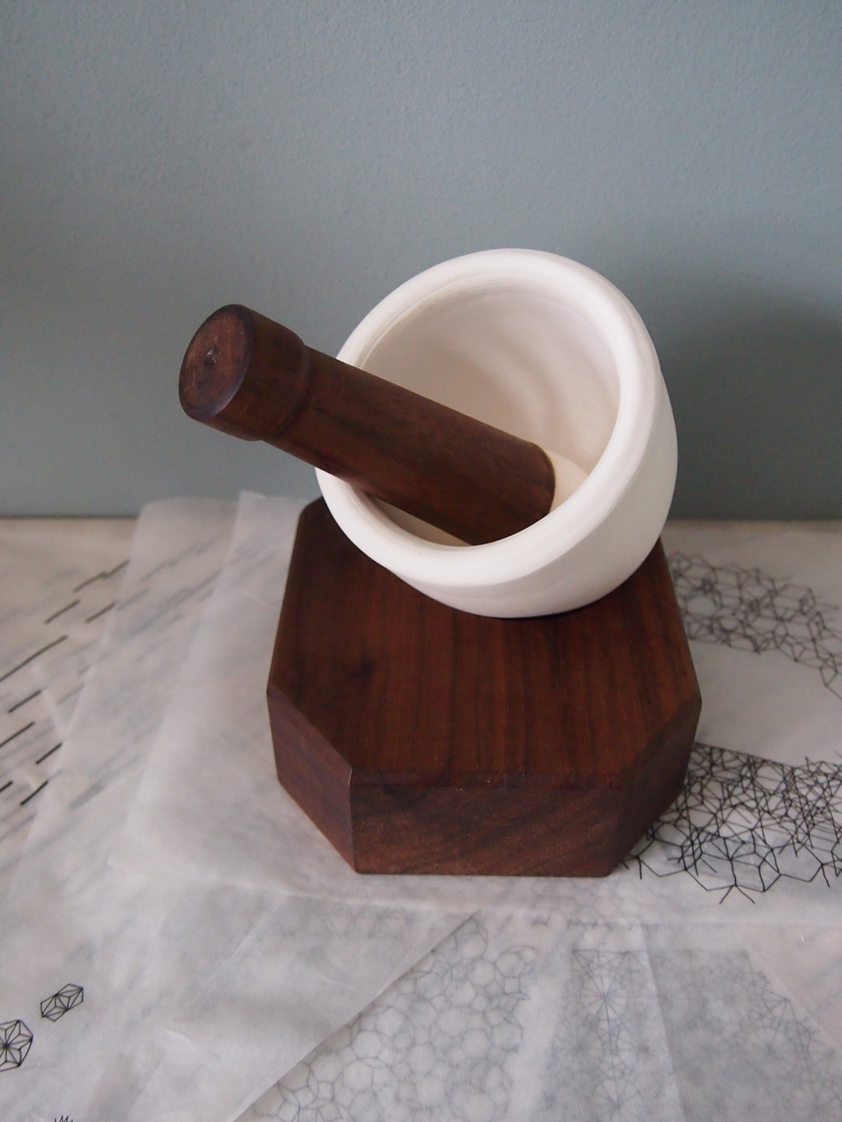 Mortar – Porcelain crucible + American Walnut base Pestle – American Walnut handle + Porcelain head